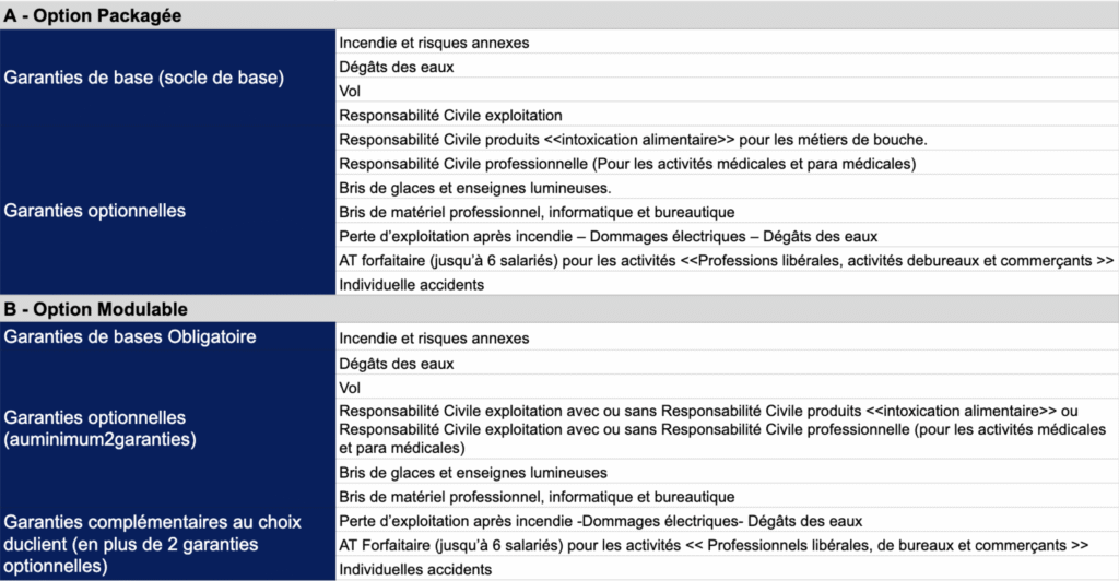 - Offre avec comme socle de base l’Incendie + au moins 2 garanties optionnelles et en option une ou plusieurs garanties complémentaires ;